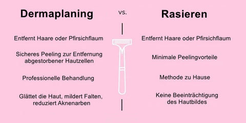 Beim Rasieren werden stärkere und schärfere Klingen als ein Skalpell verwendet, die auch durch dickes und dichtes Haar schneiden können. Es dient hauptsächlich dazu, die Haare auf der Haut zu entfernen, um eine weiche und seidige Textur zu erhalten. Durch die Rasur wird die Haut automatisch gepeelt und es werden alle Vorteile und Ergebnisse erzielt, die man auch beim Dermaplaning erzielen kann.