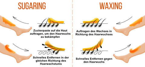 Sugaring ist dem Waxing insofern ähnlich, als dass beide die Haare durch das Auftragen einer Substanz abziehen und sie dann schnell entfernen. Allerdings unterscheidet sich Sugaring bei dicken Haaren und anderen Haartypen von Waxing durch die Richtung, in die das Haar gezogen wird. In der Regel wird die Zuckersubstanz entgegen der Haarwuchsrichtung aufgetragen und dann in der gleichen Richtung wie das Haarwachstum entfernt. Das Sugaring-Ergebnis kann 6 bis 8 Wochen anhalten, ähnlich wie beim Waxing. Auch Sugaring ist schmerzhaft.