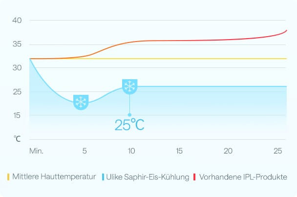 Das Ulike Saphir IPL-Gerät zur Haarentfernung nutzt modernste Technologie, um Haare langfristig zu entfernen, und zwar auf eine Weise, die weniger schmerzhaft ist als die herkömmliche Laser Haarentfernung. Die IPL-Therapie (Intense Pulsed Light) wurde erstmals 1992 von Dr. Goldman, Dr. Fitzpatrick und Dr. Eckhouse für die Behandlung von Teleangiektasien der Beine entwickelt. IPL, die von Ulike eingesetzte Technologie, verwendet dieselben Wellenlängen des Lichts, um die Haarwurzeln gezielt zu zerstören, indem das Pigment (Melanin) des Follikels thermodynamisch erhitzt wird. Die Saphir Eiskühlungstechnologie™ bietet einen wirksamen Schutz für die Haut, indem sie die Spitze des Geräts thermoreguliert, damit sie trotz der Hitze der Lichtblitze kühl bleibt.
