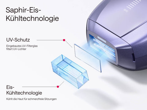 - Die neue Generation der Saphir-Eis-Kühltechnologie, die die Genitalien vor den IPL-Strahlen schützt.