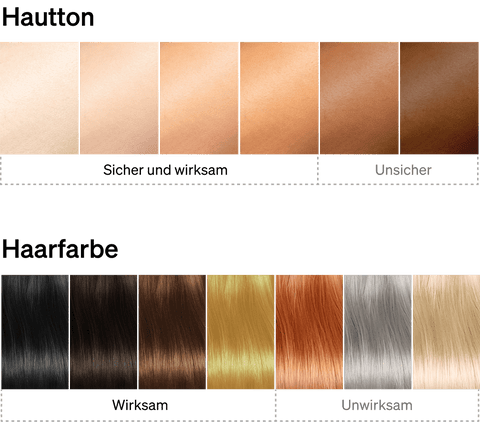 - Beide Geräte sind nicht für blondes, rotes oder graues Haar geeignet, da sie eine sehr geringe Melaninkonzentration aufweisen.