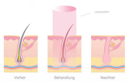 - Wenn das Licht des Lasers vom Haar absorbiert wird, wandert es bis zur Wurzel und wandelt sich dort in Wärme um, wodurch der Haarfollikel geschädigt und zukünftiges Haarwachstum verhindert wird.