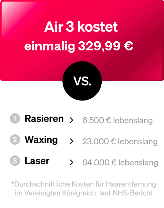 Wenn du eine langanhaltende Haarentfernung willst, ohne das Budget zu sprengen, ist ein IPL-Gerät für zu Hause perfekt. Ein einziges Gerät kann jahrzehntelang halten und bietet auf lange Sicht enorme Einsparungen im Vergleich zu professionellen Behandlungen und Rasieren.